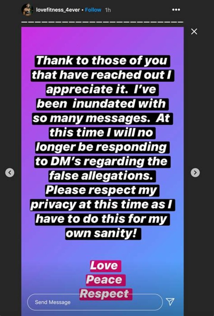 Lisa concluded, "Thanks to those of you that have reached out I appreciate it. I've been inundated with so many messages. At this time I will no longer be responding to DM's regarding the false allegations. Please respect my privacy at this time as I have to do this for my own sanity!"