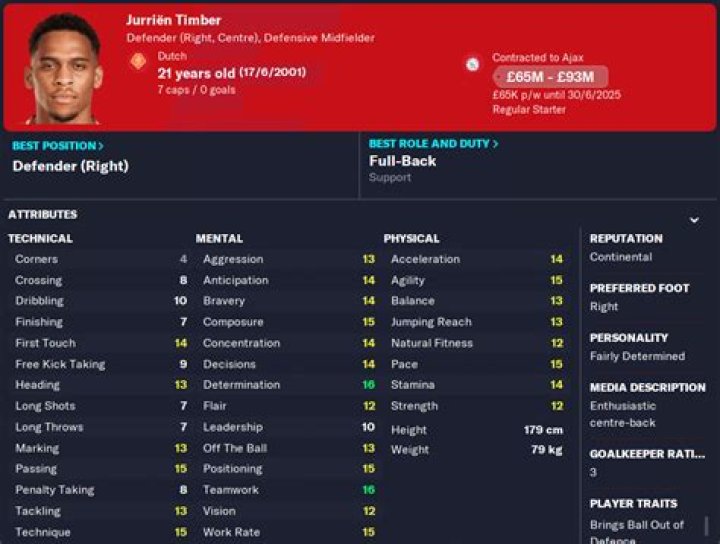 Jurrien Timber is a Defender – Center-Back who plays on the right foot.