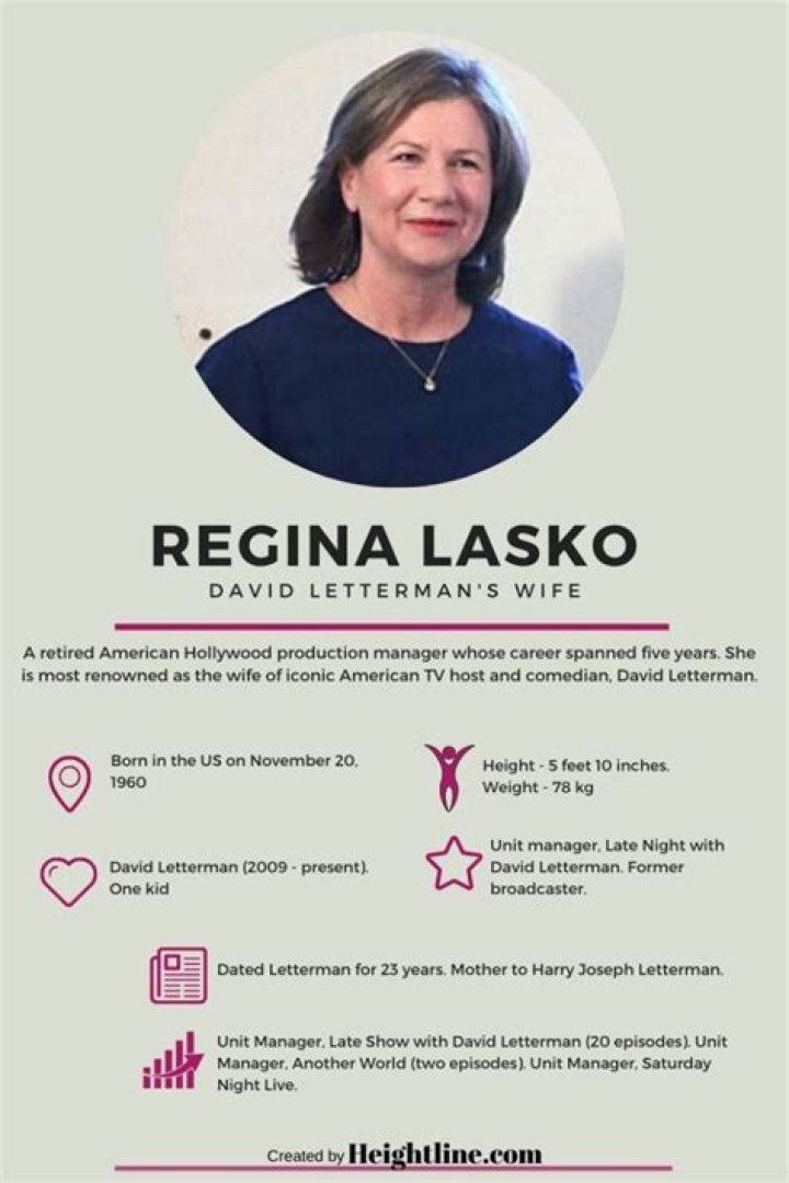 | Name | Regina Lasko ||---|---|| Birthdate | July 26, 1961 || Birthplace | Chicago, Illinois || Occupation | Television Producer || Spouse | David Letterman (m. 2009) || Children | Harry Letterman (b. 2003) | Who Is Regina Lasko All About David Letterman?For years, the enigmatic figure of Regina Lasko has cast a long shadow over the legendary late-night talk show host, David Letterman. Rumors and speculation have swirled about their relationship, leaving fans and the public alike eager to unravel the truth. "Who Is Regina Lasko All About David Letterman?" delves into the depths of this intriguing story, shedding light on the woman who became an integral part of Letterman's life and career.