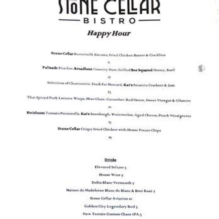 Question 6: Does Stone Cellar Bistro have a happy hour?Yes, Stone Cellar Bistro offers a happy hour from Monday to Friday from 5pm to 7pm. The happy hour menu features discounted drinks and appetizers.